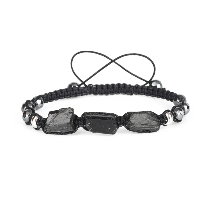 Natural Rough Black Tourmaline Healing Stone Bead Faceted Hematite Nylon Rope Adjustable Macrame En